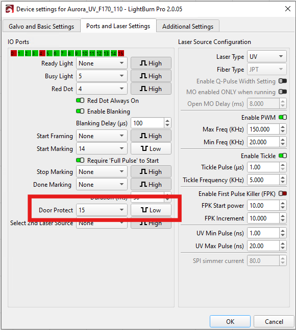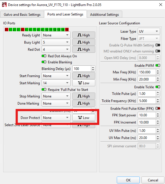 Depending on which version of Lightburn you have, the steps to get to the Ports and IO settings may be different as well as the general layout of the IO ports. You will need to determine which method works best and use the imagery provided to find the proper location in your software version. You can refer to Lightburn Software's KB for further details.