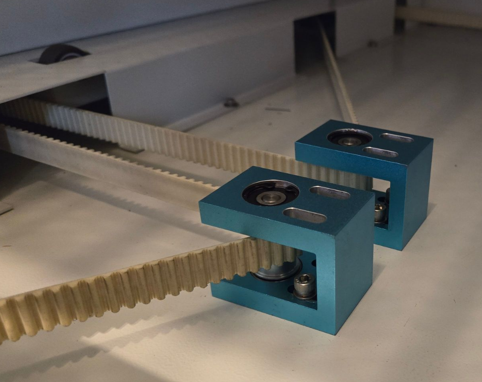 8. Put the belt inside the three blue tension bases and reinstall the tensioner pulleys. Then tighten the one on the right. You do not have to make it the belt super snug, we will be adjusting the Z bed later on and will need to remove tension to do so.