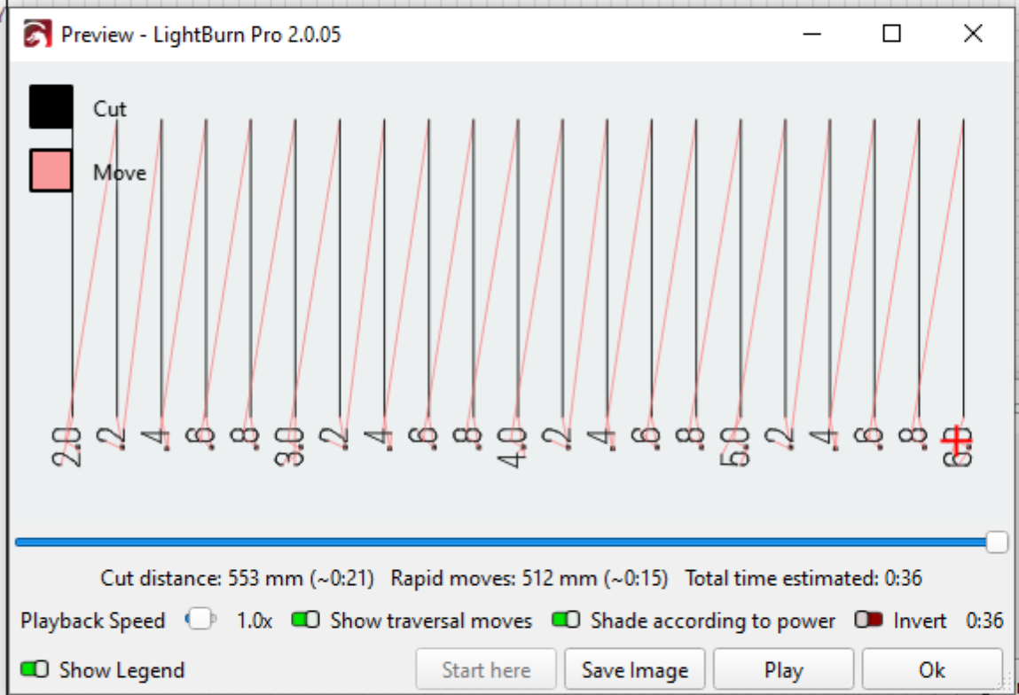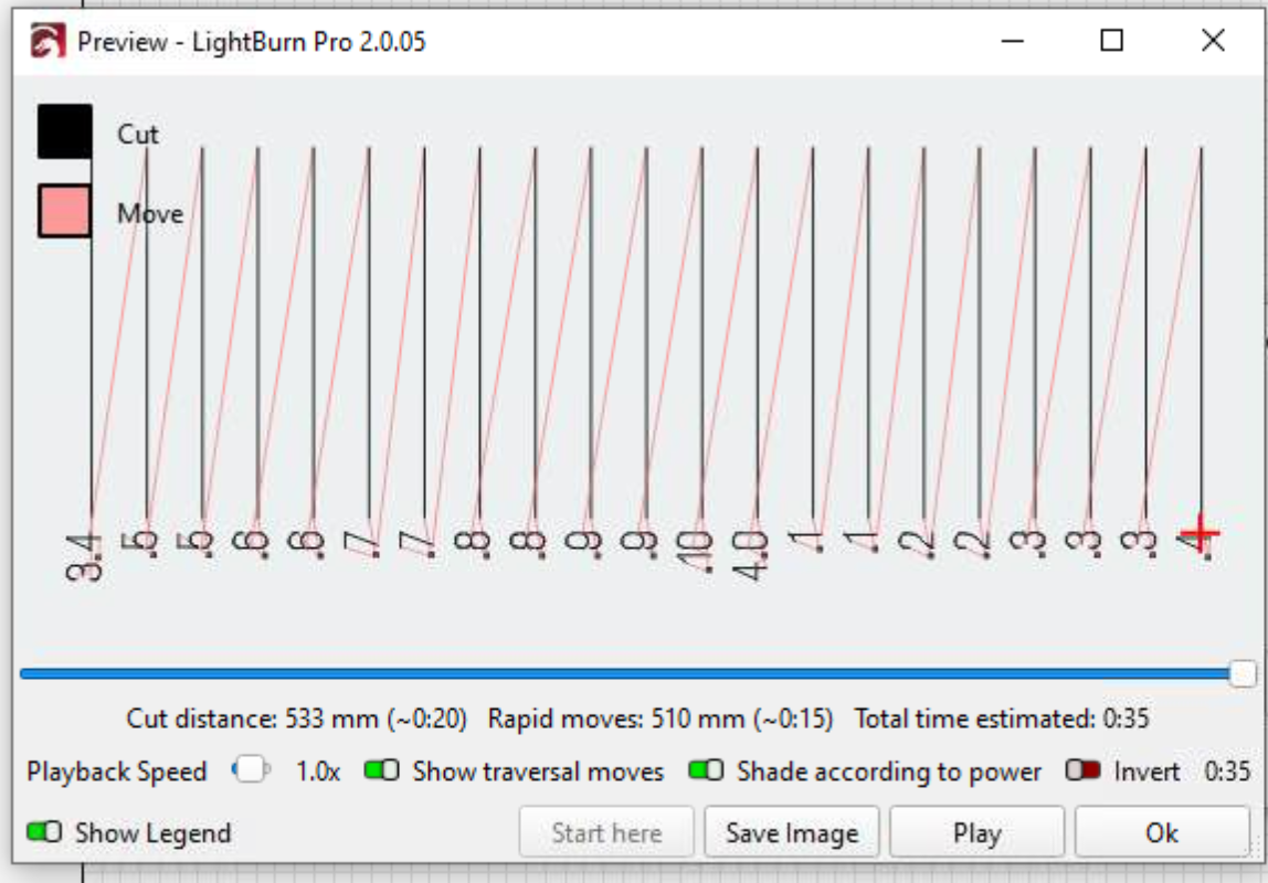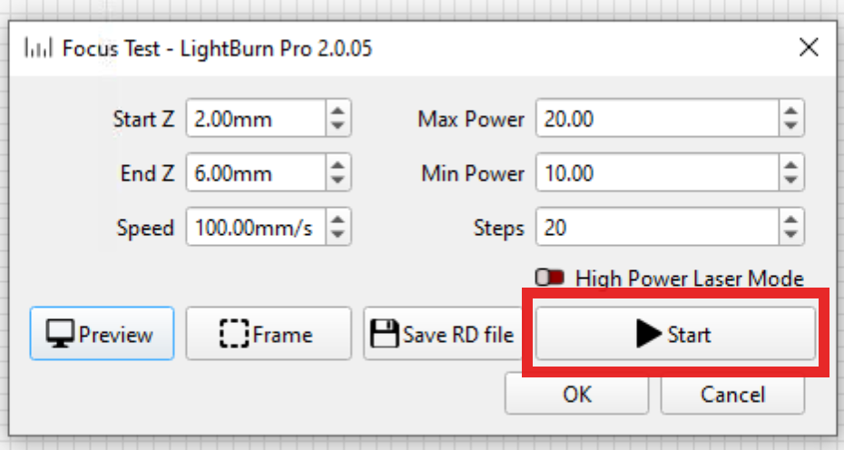 Start the Focus Tool job using the Start button in the Lightburn Focus Tool Prompt: