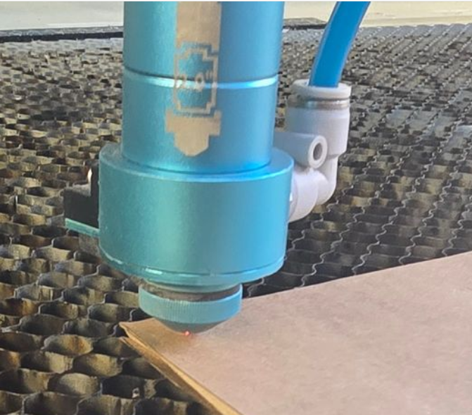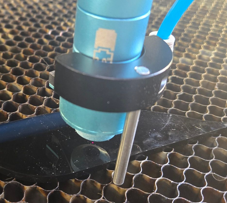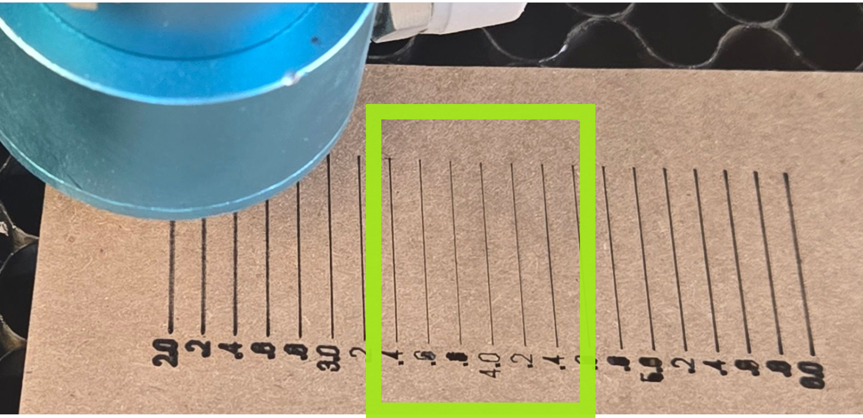 Lets go back to the laser machine. and perform Autofocus to the surface of your test aterial, the lens will be a little closer now that the Focus Distance is set to 0.00mm in the machine settings.
