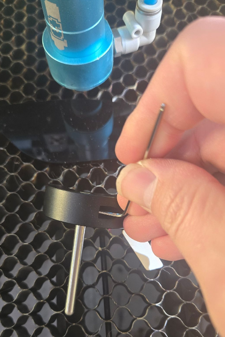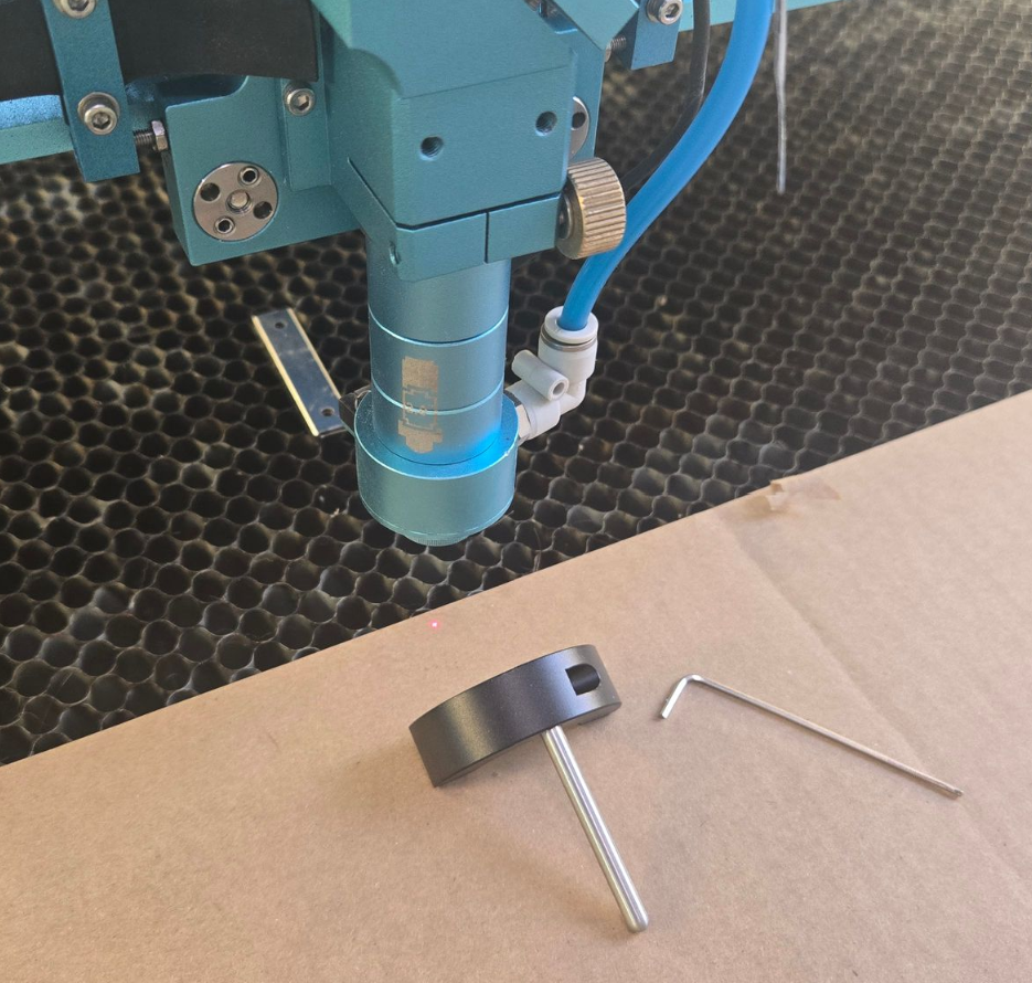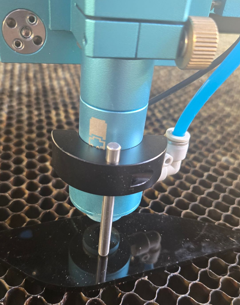 Place the material under the laser head and Auto Focus the Laser head. Place the manual Focus Tool on the Laser head as shown to check the distance: