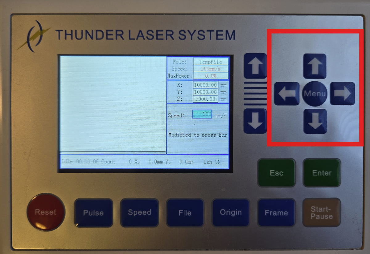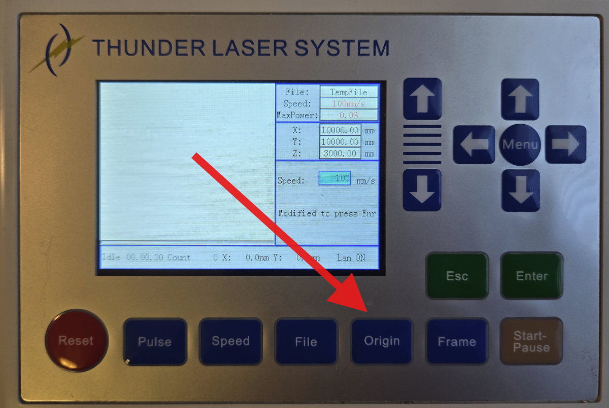 First, jog your laser head using the Laser control screen buttons so that the red dot pointer is over the top of your material.