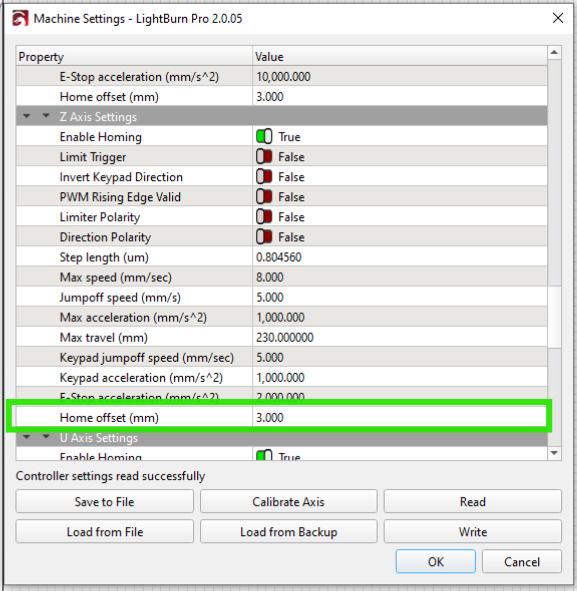 Scroll down until you find the value for "Home Offset (mm)" under the Z axis settings (Down in the Vendor settings section). Take note of your current value, write it down. Set the value to 3.00mm and then use the "Write" button to send the change to the controller. Click the OK button to close out the Machine Settings window.