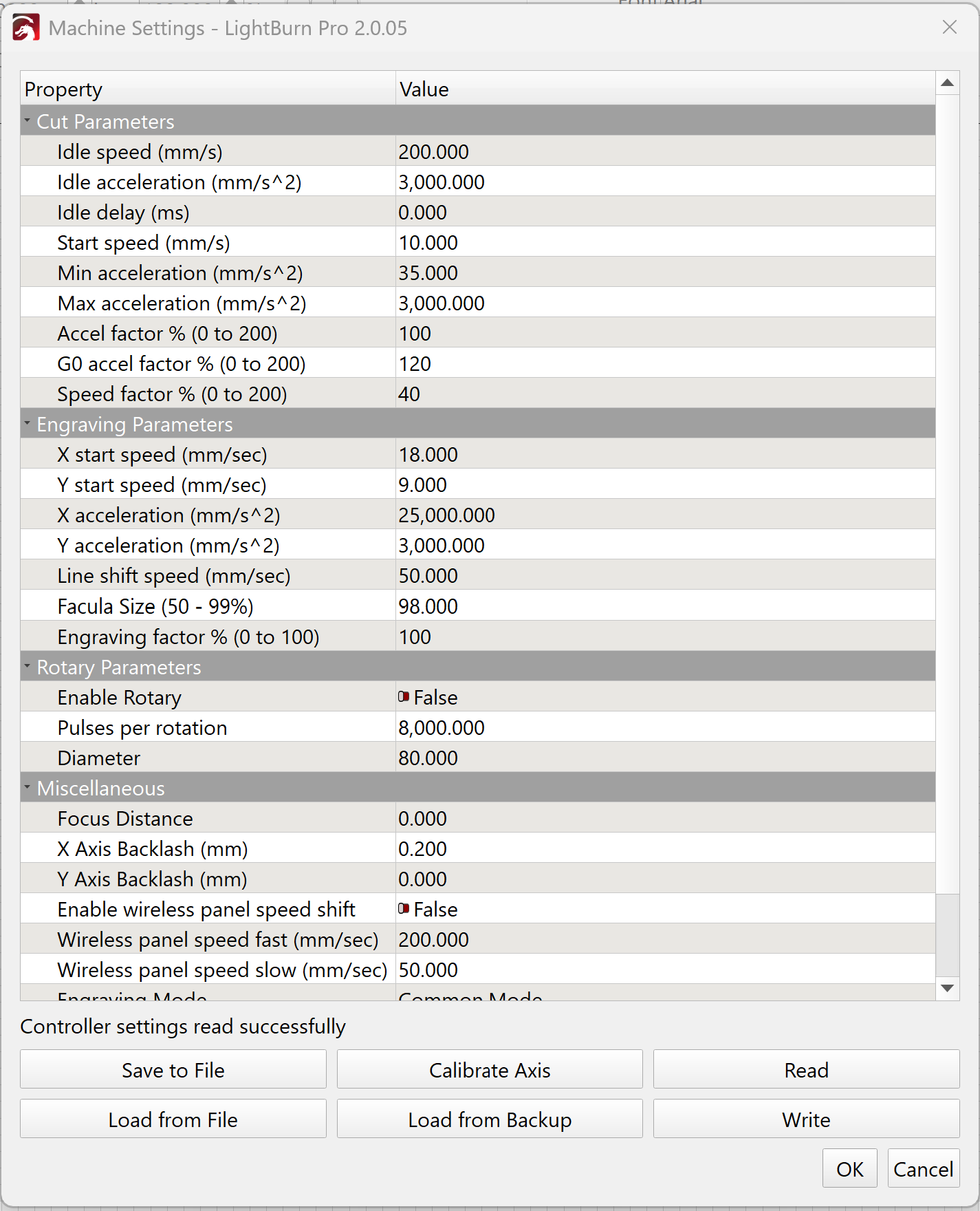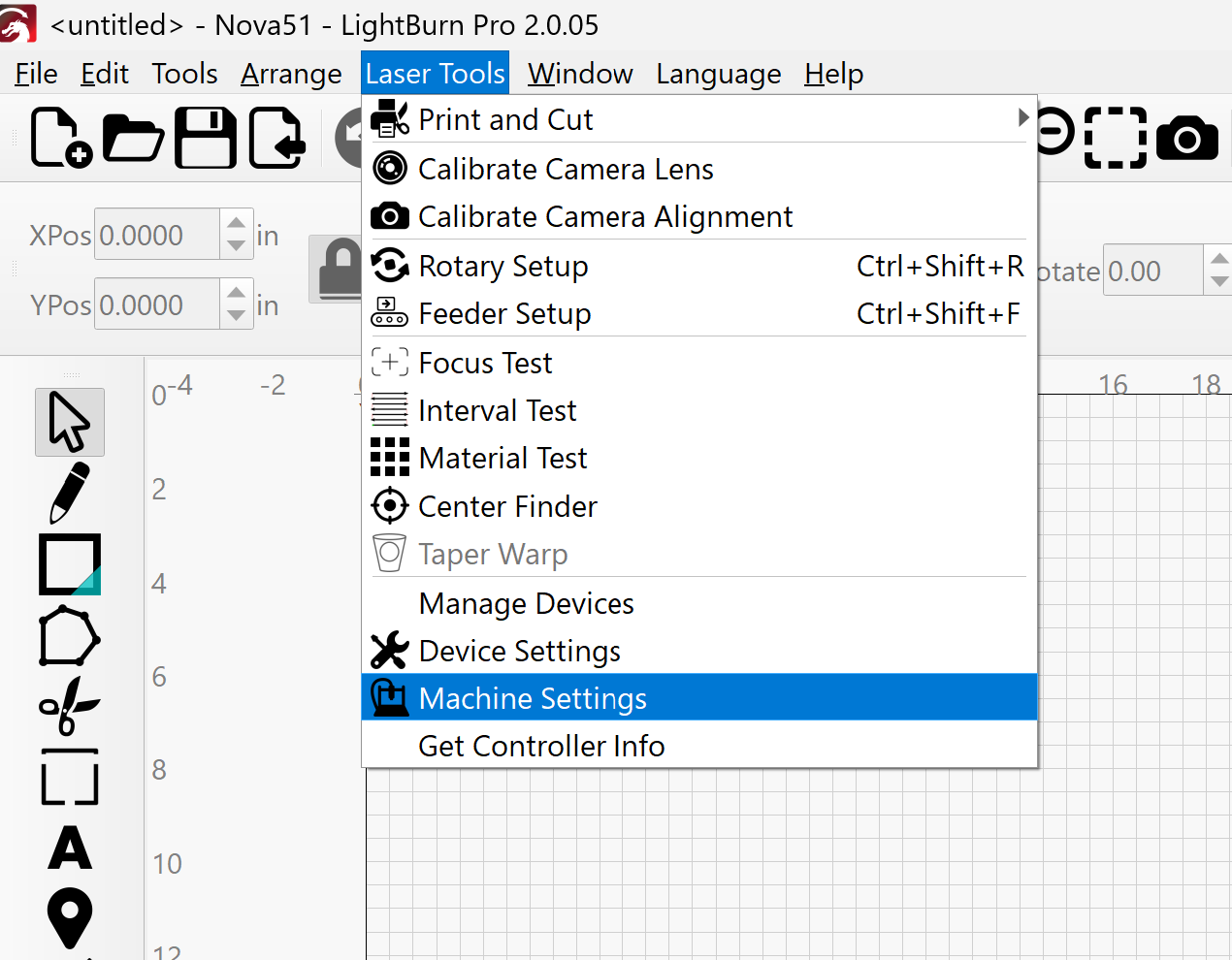 In Lightburn, goto Laser Tools>Machine Settings (will be under Edit>Machine settings if you are on older versions of Lightburn)
