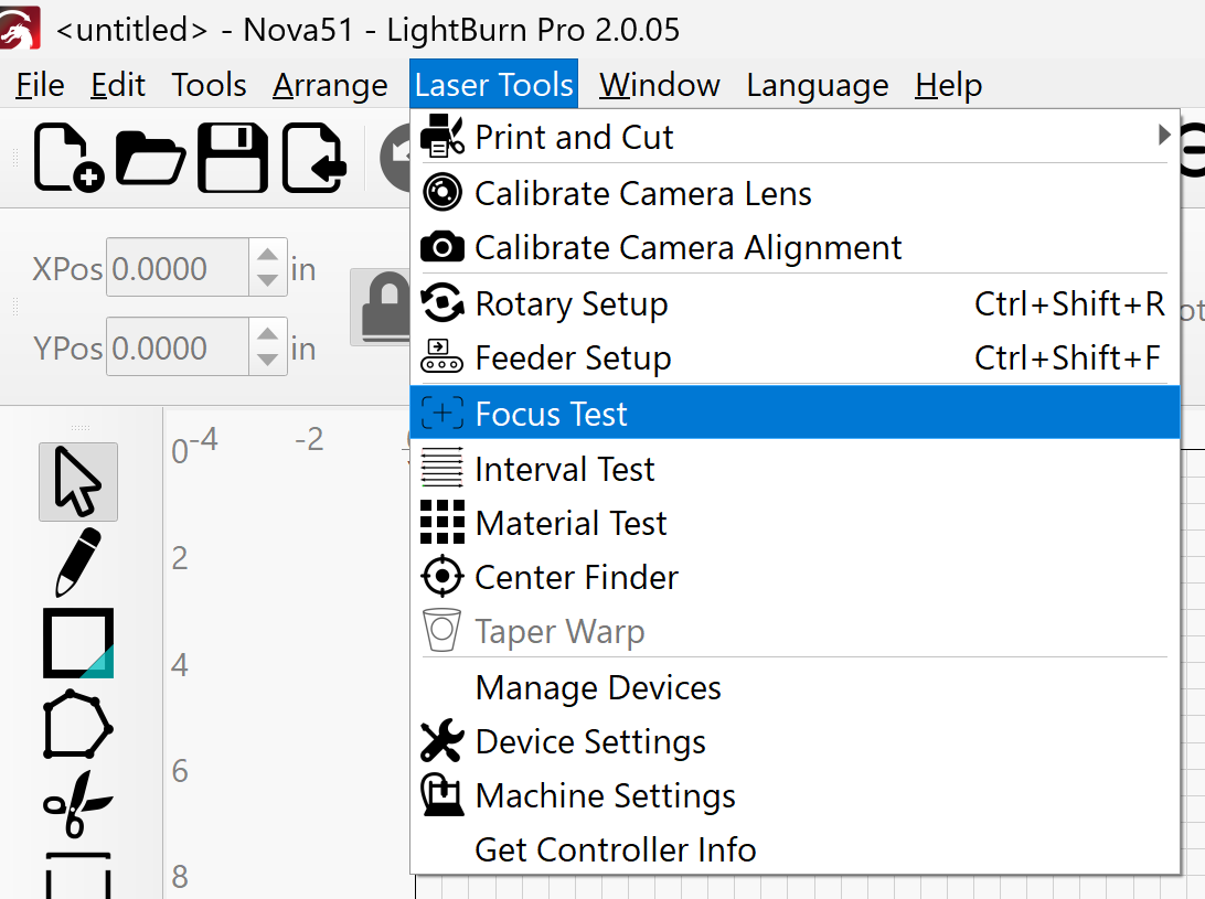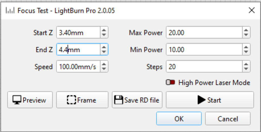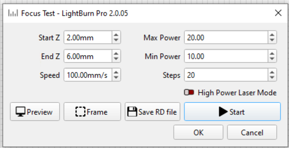 Open the Focus Test Tool in Lightburn from the Laser Tools menu