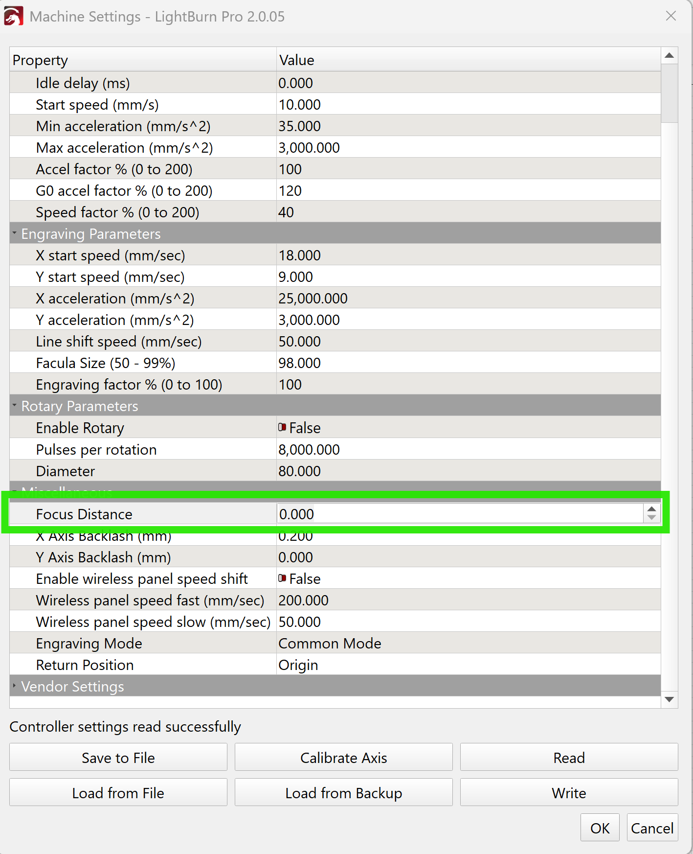 Scroll down until you find the value for "Focal Distance". Take note of your current value, write it down. Set the value to 0.00mm and then use the "Write" button to send the change to the controller.