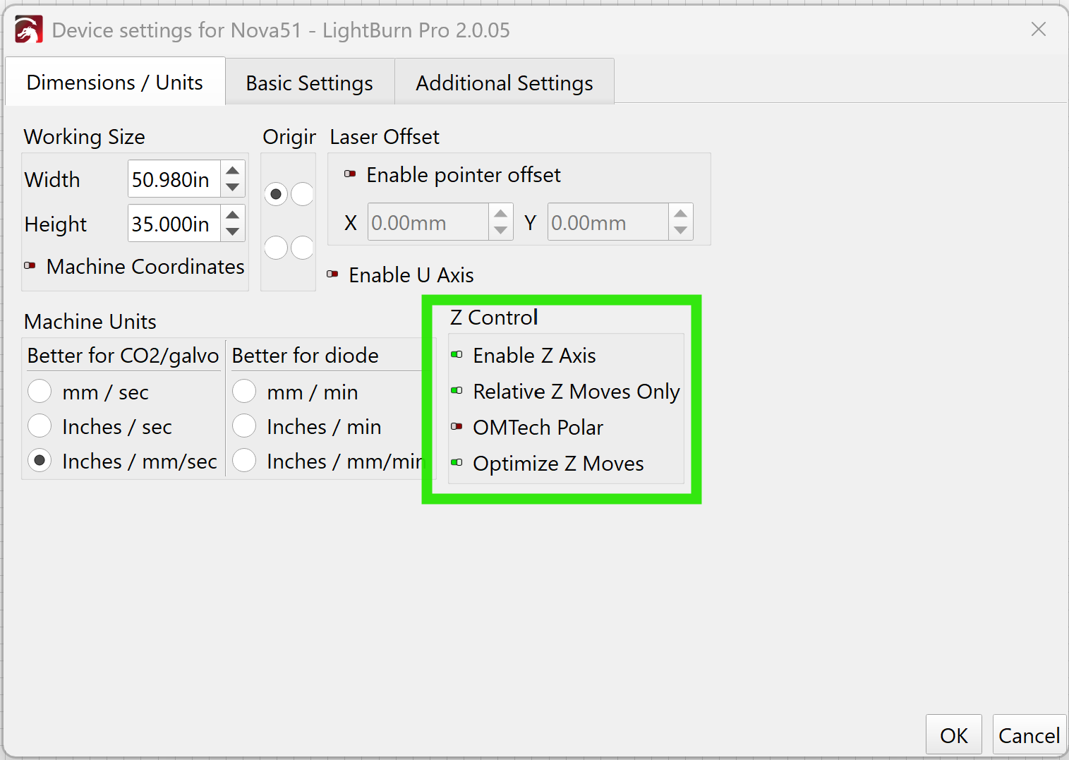 The Device Settings Prompt will open up and you will need to set the following to Green under the Z Control section