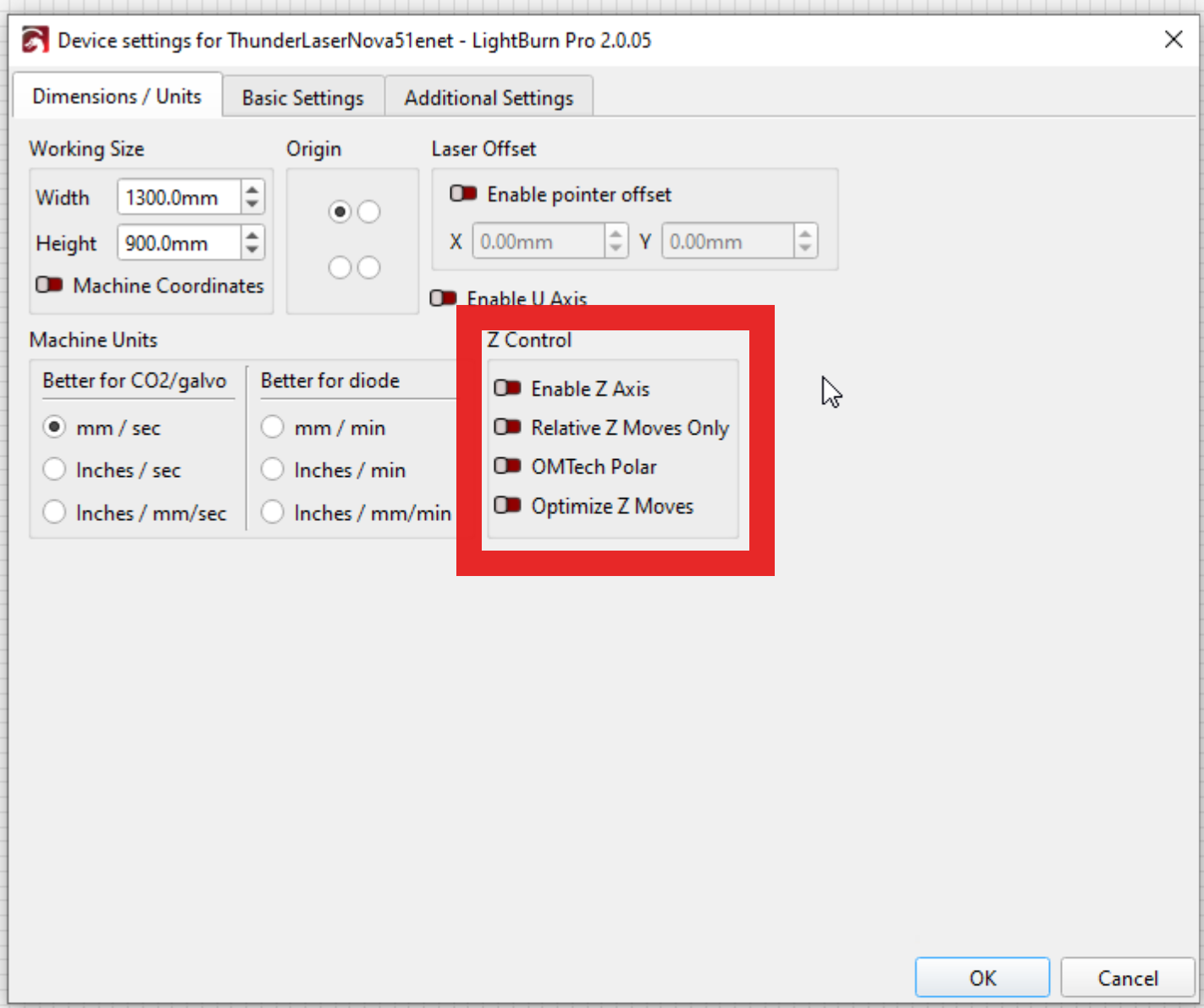 The Device Settings Prompt will open up and you will need to set the following to Red under the Z Control section