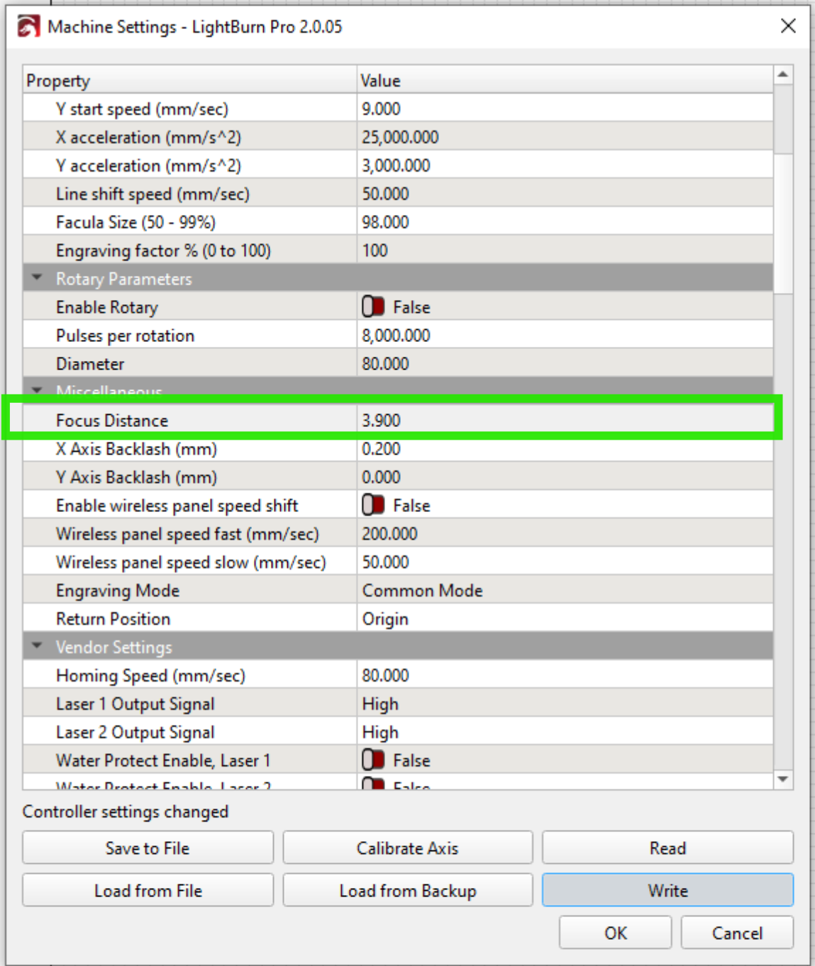 In Lightburn, goto Edit>Machine Settings and scroll down to find the Focal Distance setting which should be at 0.00mm. Type in the new value, in this case 3.9mm, and use the "Write" button to send them to the laser machine. Do not close out the "Machine Settings" screen just yet.