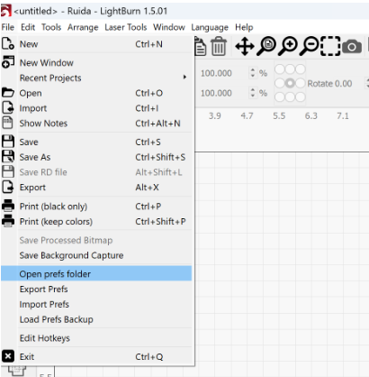 *Depending on your vintage of Lightburn, the link to the Prefs folder might be right under the FILE listing or in a sub-menu