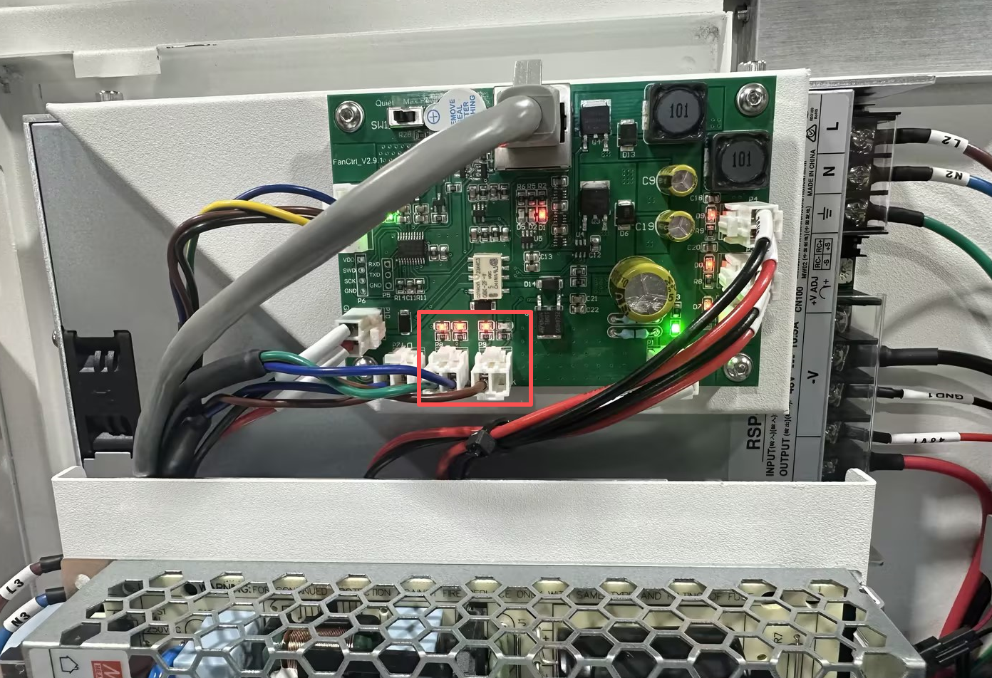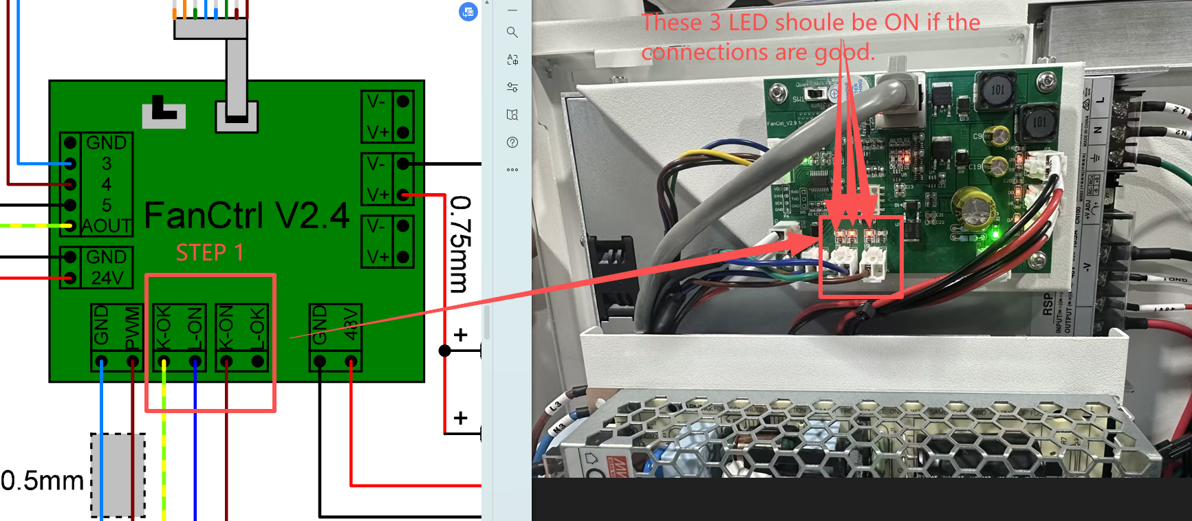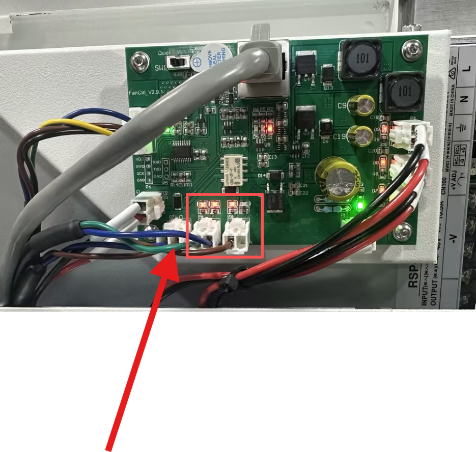 Conclusion: If the above three steps check out, the LEDs on the Fan control board should light up as shown below.