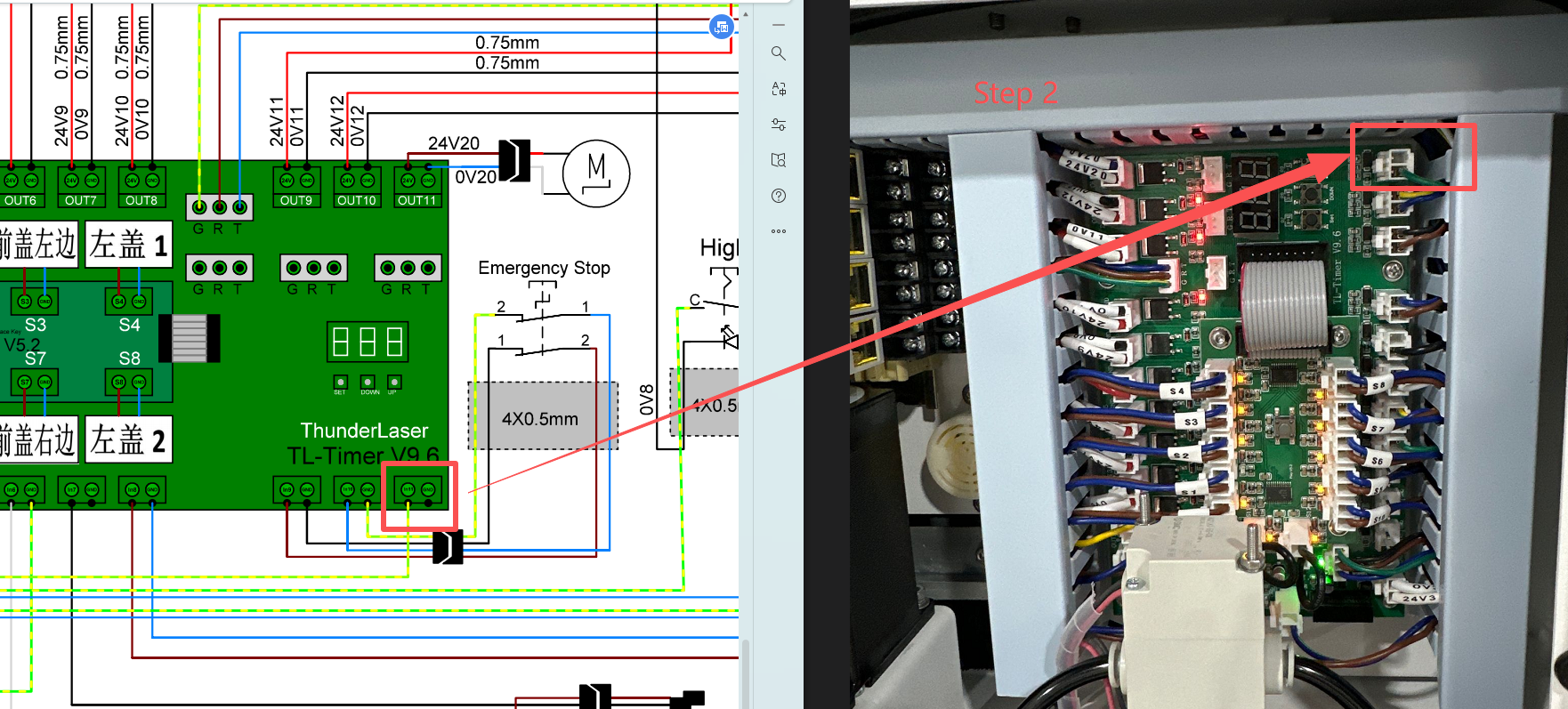 In the top right and at the bottom, the K-OK, K-On and L-On wires from the fan board are connected to the TL Timer, highlighted in the red square
