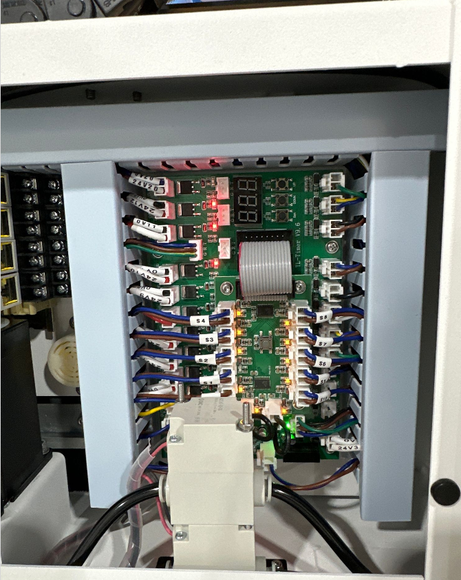 The TL timer is on the left hand side of the machine, behind the door. It is the large green printed circuit board with a bunch of white connectors and wires running to it. It will have many red lights (Red is ok..not indicating an issue).