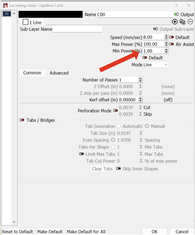 When setting up your Line cut\score layers in Lightburn, you need to be aware of how the min power setting is used. Any time that the laser head is traveling at under 10mms (even if your layer set speed is 100mms) the laser will output the Layers min power setting instead of the max power setting. This is because the head is moving so slow, it does not need as much power to cut\score and the excessive heat in the area can cause corner damage or blowout.