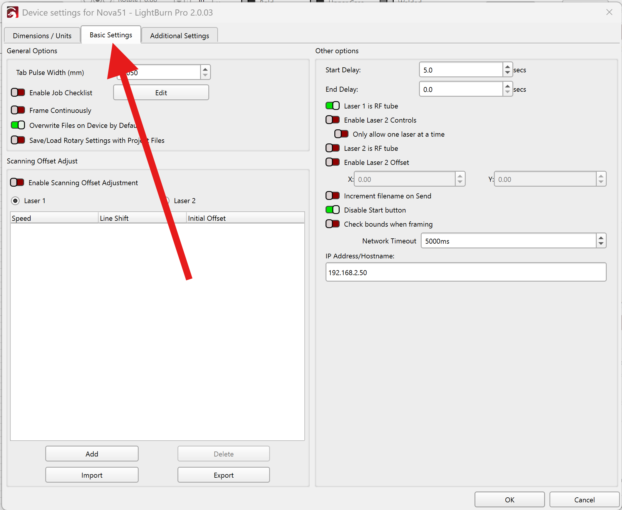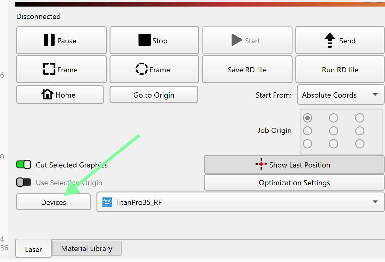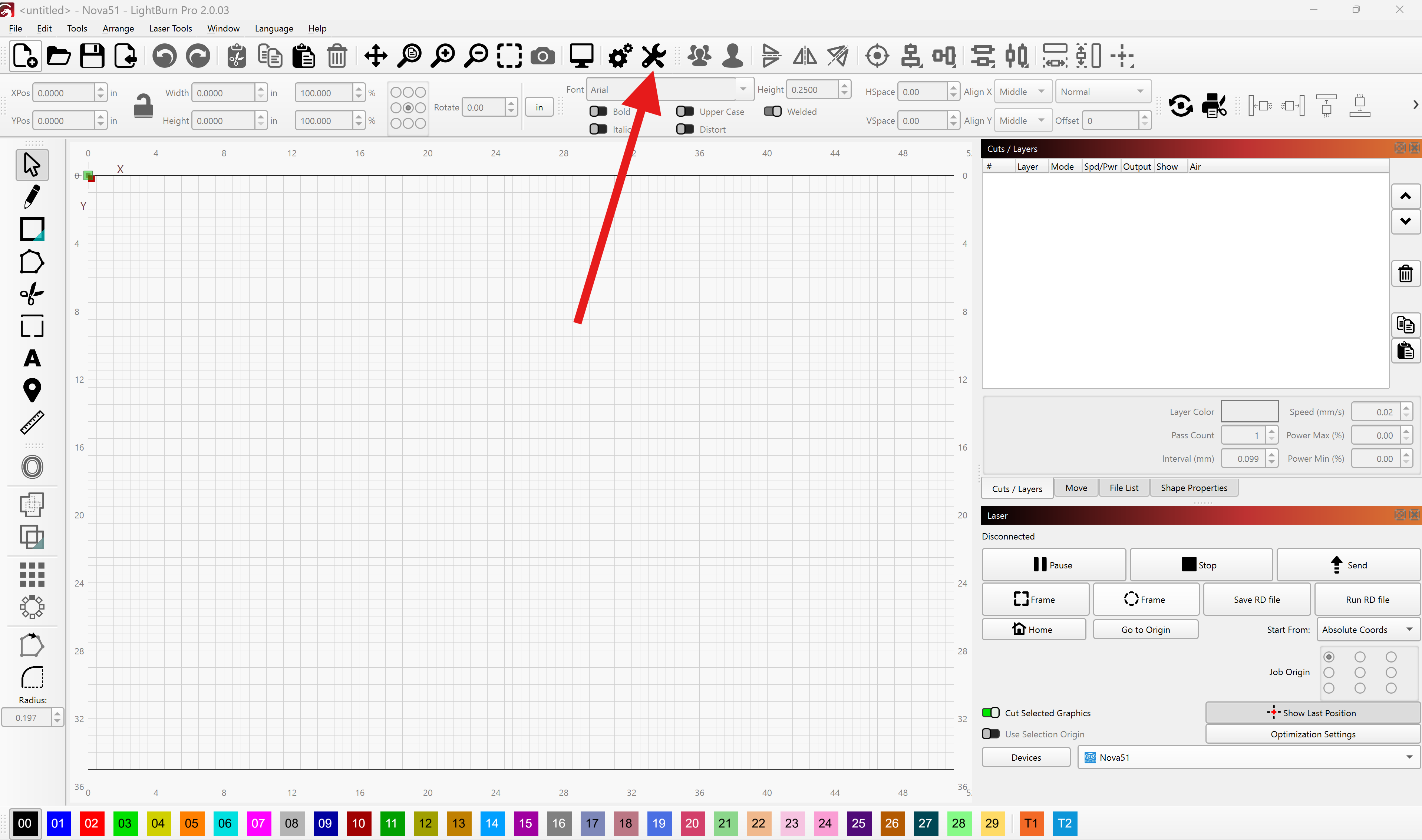 Click the Gear\Screwdriver icon of Edit>Device Settings in Lightburn