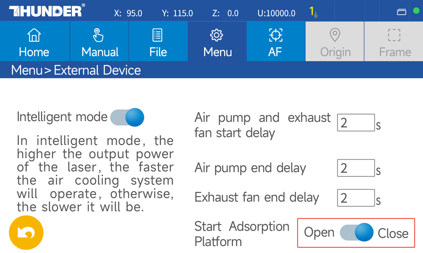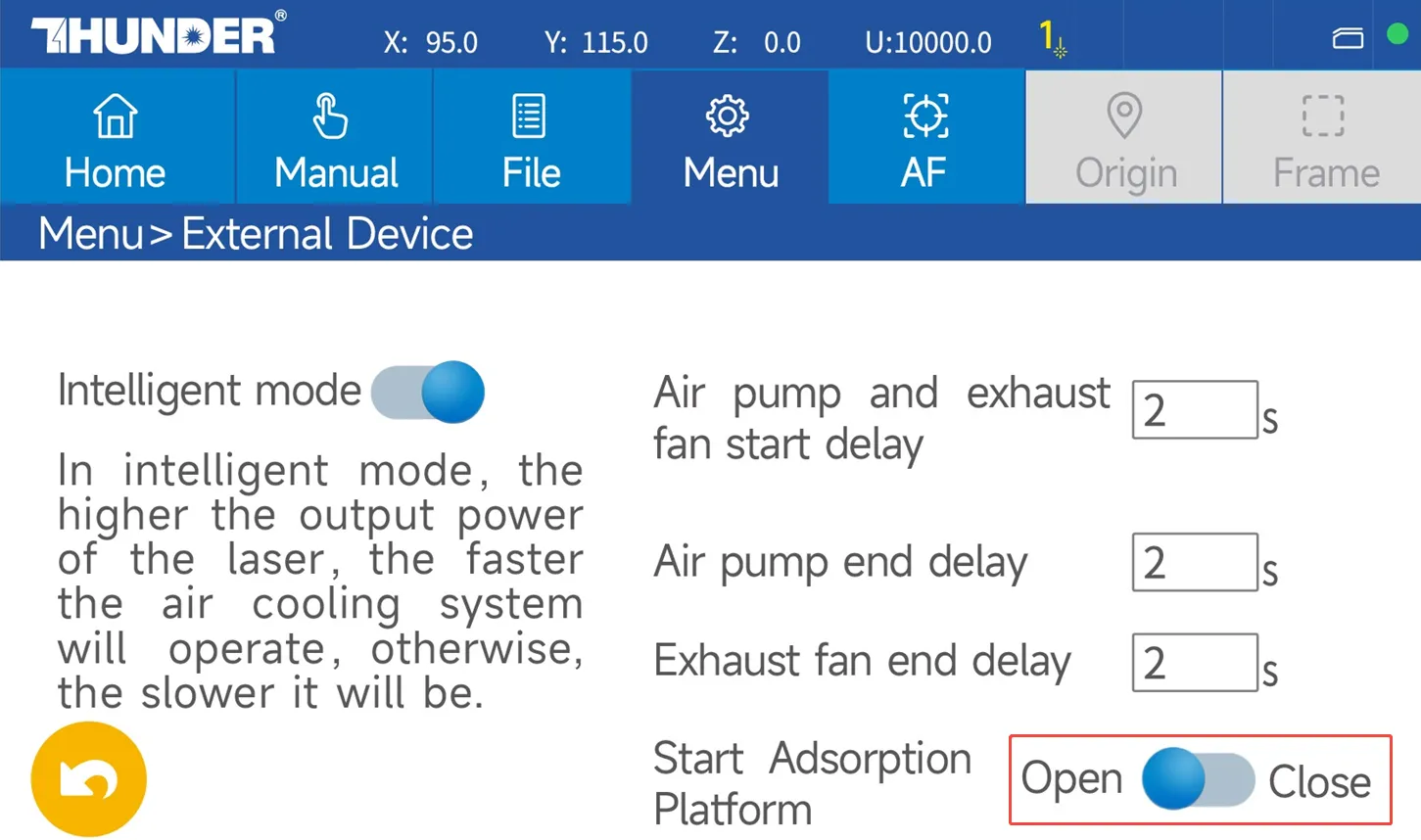 4. If the Adsorption Platform function is no longer needed, please turn off the 'vacuum adsorption platform' function on the touch panel and remove the (auxiliary) material from the platform.