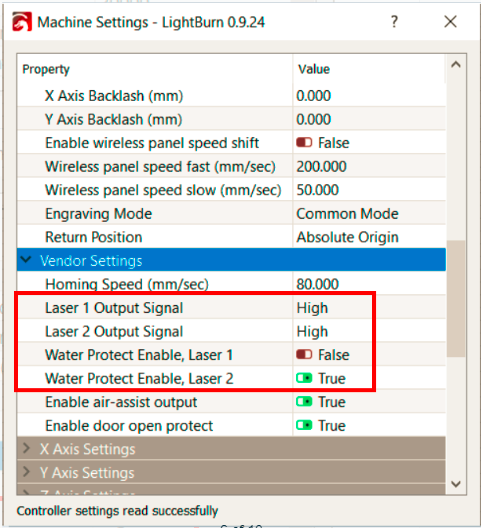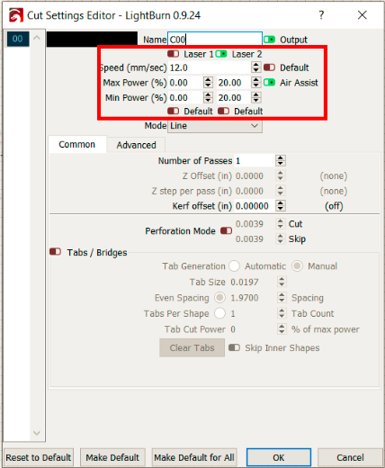 *In newer versions of Lightburn, you may be prompted to be able to see these settings, click 'ok' to the prompt.